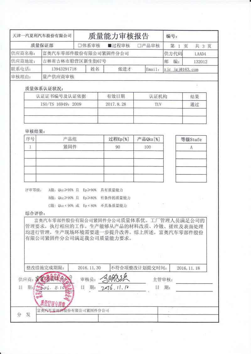 A级供应商审核报告--天津夏利